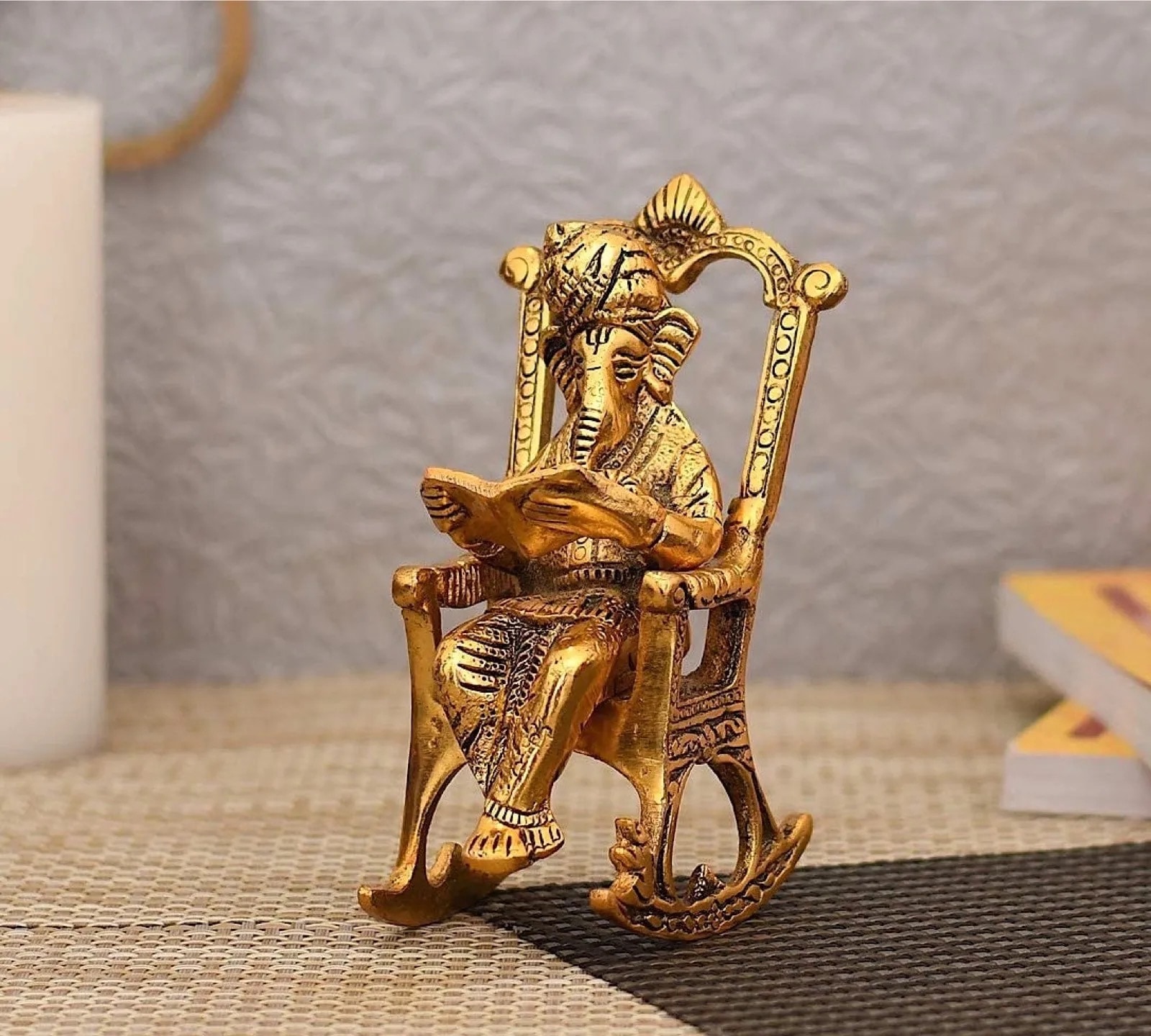 A 5.5-inch high small home decor figurine showing Lord Ganesha reading. Handmade in India from quality brass. ⇢ Amazon